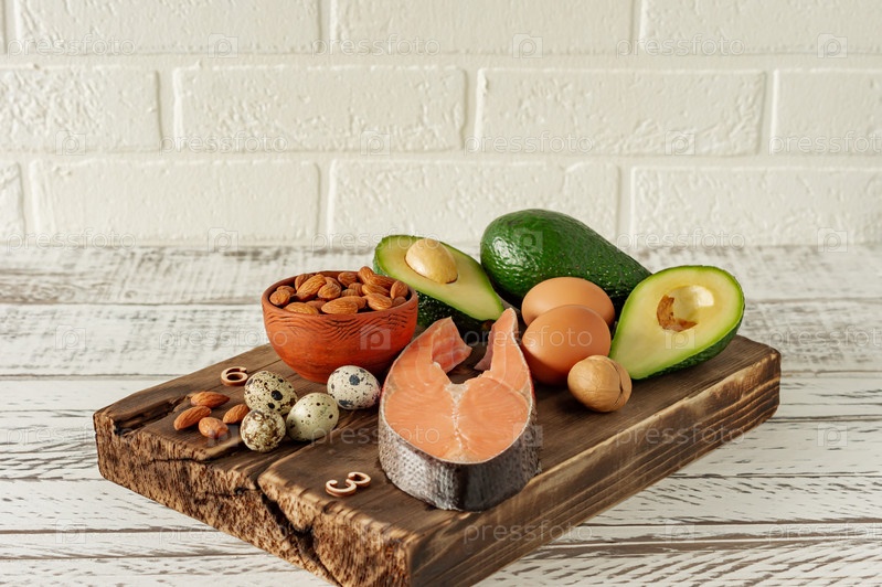 Животные и растительные источники омега-3 кислот. Концепция сбалансированного питания. Ассортимент здоровой пищи на деревянном столе