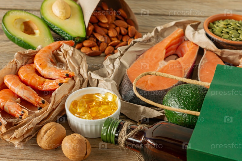 Концепция здорового питания. Природные источники омега-3 кислот. Овощи, морепродукты, орехи и семена