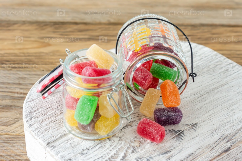 Желейные сладкие конфеты разных цветов, разбросанные по деревянному фону из стеклянной банки