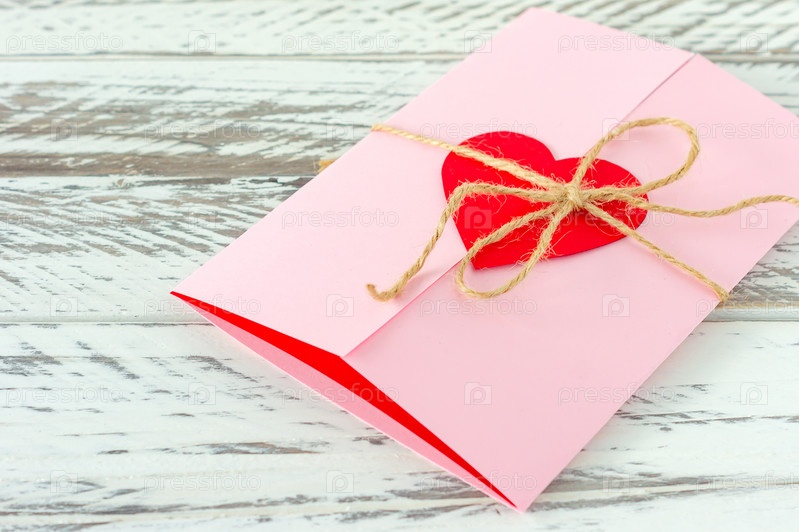 Любовное письмо с бумажным сердцем на деревянном фоне. Праздничная открытка на день Святого Валентина