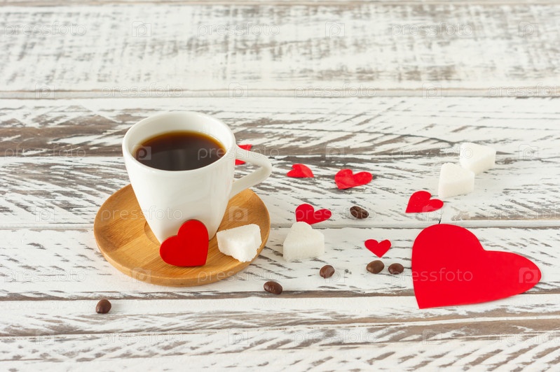 Праздничная композиция ко Дню Святого Валентина. Черный романтический кофе с сахаром в сашапе сердца и красным разбросанным бумажным конфетти в виде сердца