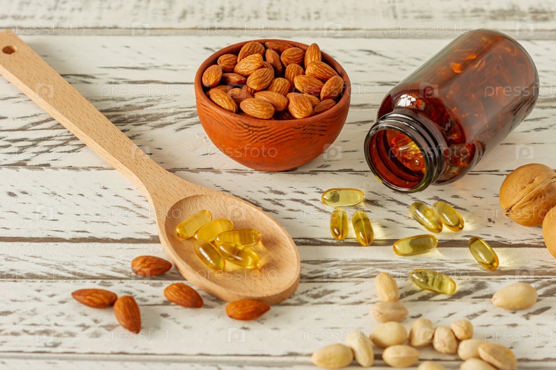 Капсулы с рыбьим жиром и ассортимент орехов на деревянном фоне и текстуре, витамин D, омега-добавка, селективный фокус