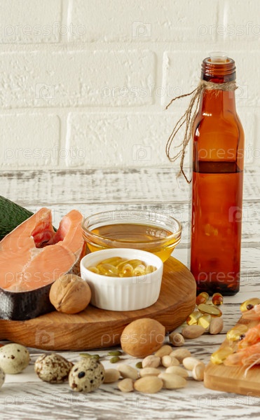 Животные и растительные источники омега-3 кислот. Концепция сбалансированного питания. Ассортимент здоровой пищи на деревянном столе