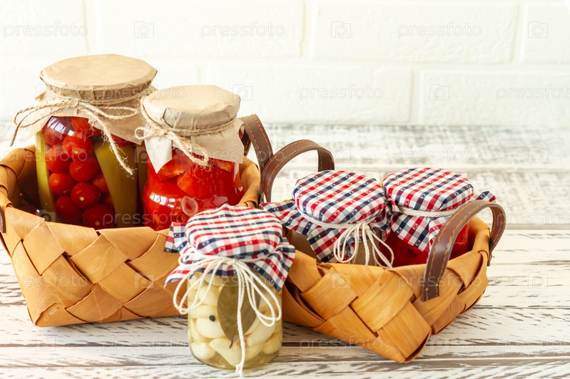 Банки для консервирования маринованных солений. Домашние помидоры, огурцы, чеснок, имбирь и маринованные огурцы. Ферментированная пища