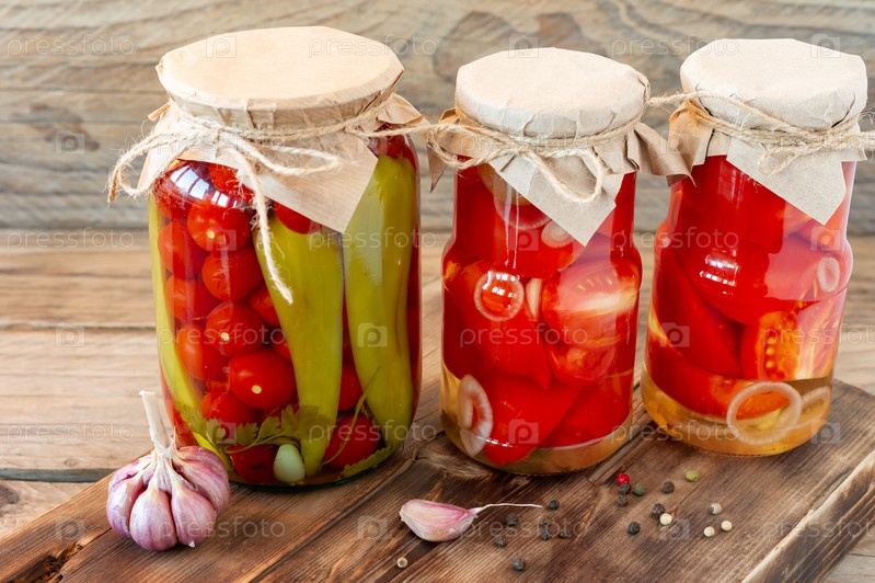 Домашние консервы из помидоров в стеклянных банках в белой плетеной корзине на деревянном фоне