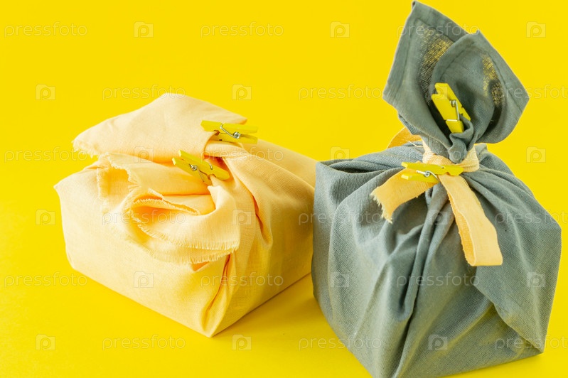 Ноль отходов, экологически чистая подарочная упаковка в традиционном японском стиле Фуросики, экологическая концепция, экологически чистый баннер. Модные цвета 2021 года Сияющий желтый и окончательный серый
