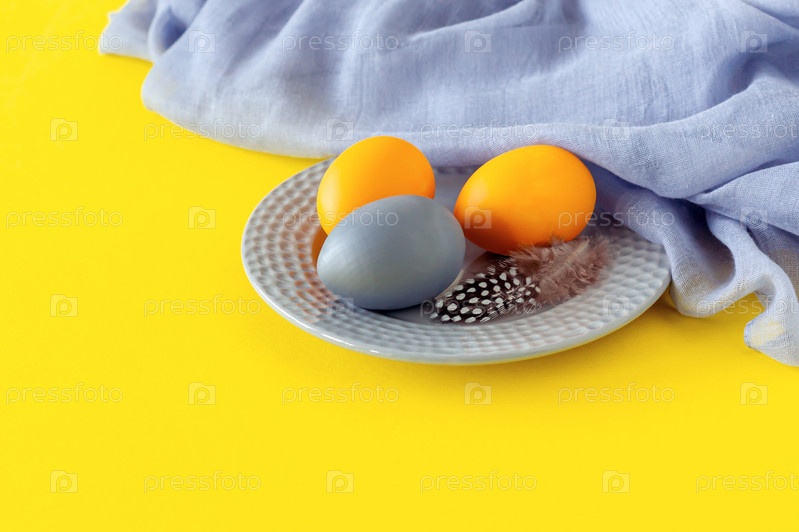 Пасхальная концепция в модных цветах, освещающих желтый и серый. Крашеные яйца на тарелке с копирайтом