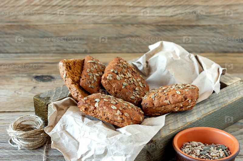 Крупный план многозерновых или цельнозерновых булочек в ткани, выложенной в деревянной коробке