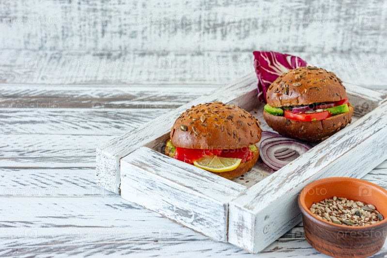 Свежеприготовленный домашний гамбургер веганский и с лососем на деревянном фоне. Здоровые органические продукты