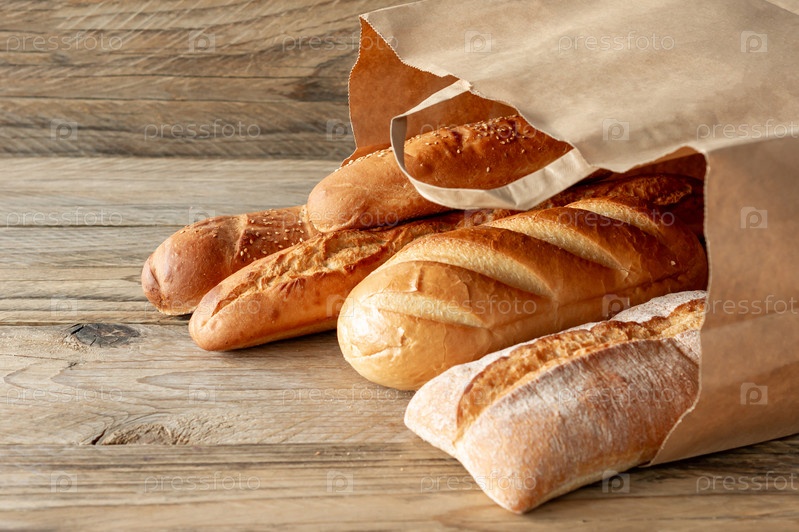 Разложенная выпечка в бумажном пакете на деревенском деревянном столе