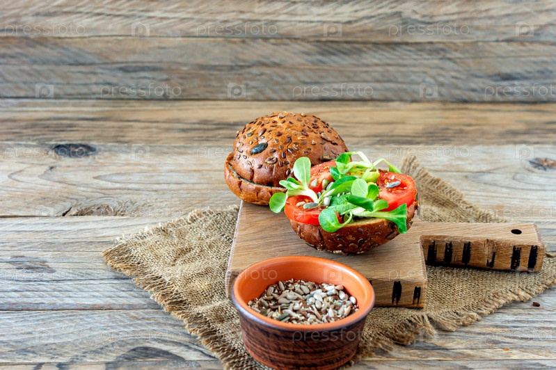 Веганские бургеры с кукурузным салатом и помидорами на деревянном фоне. Концепция питания на растительной основе