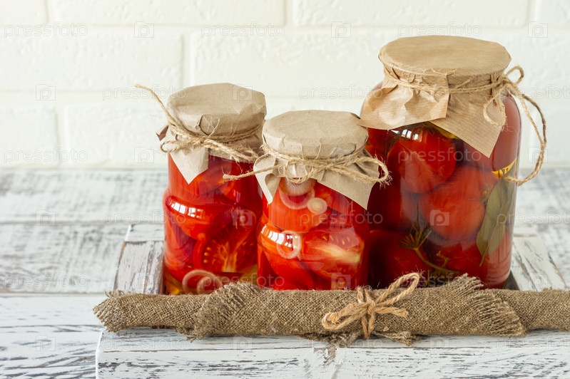 Стеклянные банки с консервированными помидорами с чесноком и перцем. Ферментированная пища на белом деревянном фоне