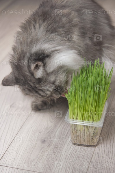 Милый котенок с забавным лицом ест органическую траву