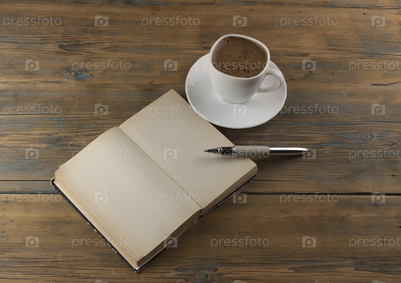 Откройте книгу с пустой страницей, ручку и чашку кофе на столе