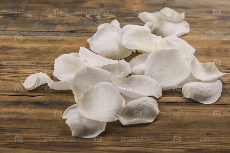 Белые лепестки роз на белом деревянном столе. Романтическое свидание. День рождения. Свадьба. Праздничный день. Копировать пространство