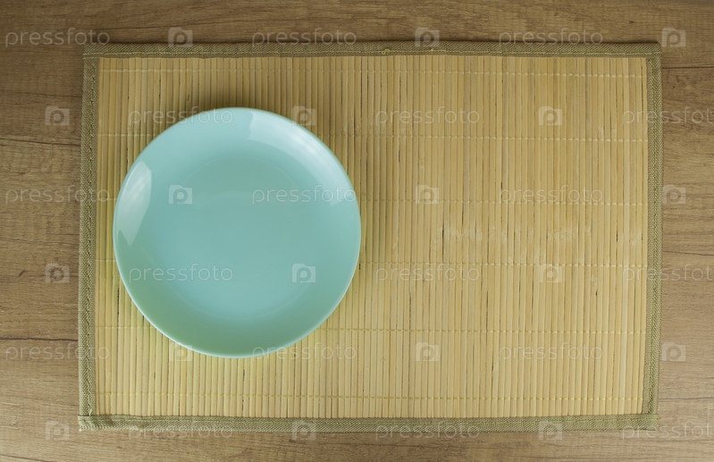 Керамическая тарелка (тарелка) на бамбуковой циновке. Плоская планировка. Вид сверху