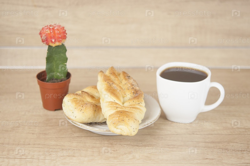 Две булочки с маком с кофейной чашкой на деревянном столе. Завтрак. Доброе утро