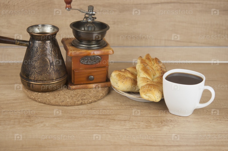 Две булочки с маком с кофейной чашкой на деревянном столе. Завтрак. Доброе утро