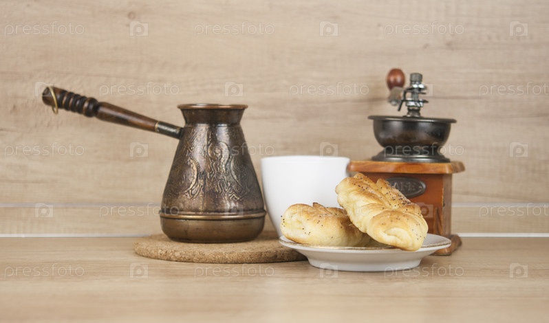Две булочки с маком с кофейной чашкой на деревянном столе. Завтрак. Доброе утро
