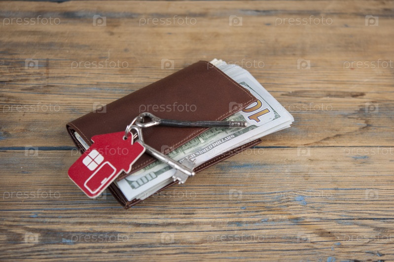 Коричневый кожаный бумажник со стодолларовыми купюрами на деревянном столе. Вид сверху