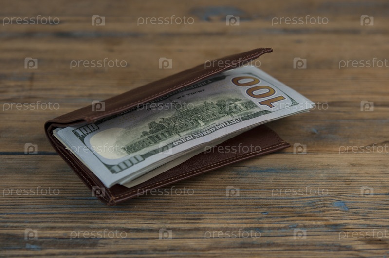 Коричневый кожаный бумажник со стодолларовыми купюрами на деревянном столе. Вид сверху