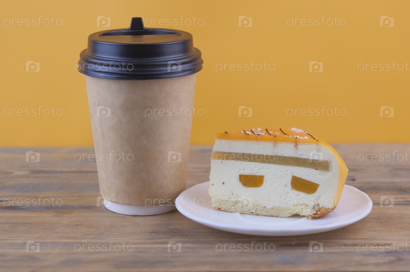 Красный бархатный сливочный сыр с черным кофе в бумажной чашке, деревянный фон