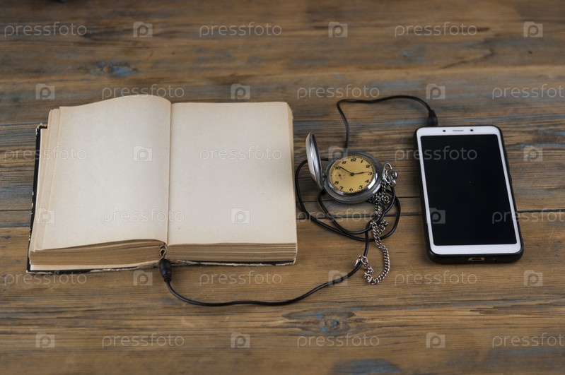 Черные наушники со смартфоном и открытой книгой лежат на деревянном столе. Концепция аудиокниги. Дистанционное обучение