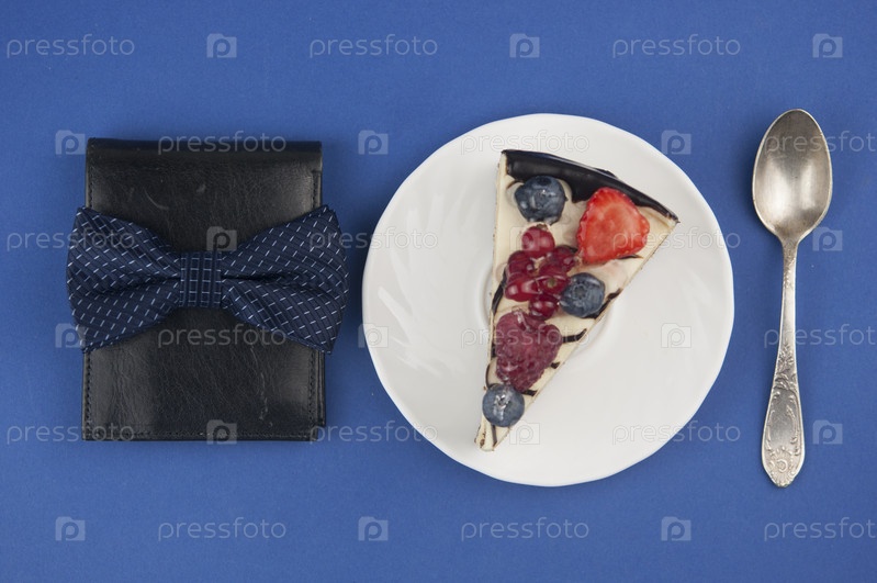 Смешайте ягодный торт на белой тарелке с галстуком-бабочкой на синем фоне С Днем отца. Вид сверху
