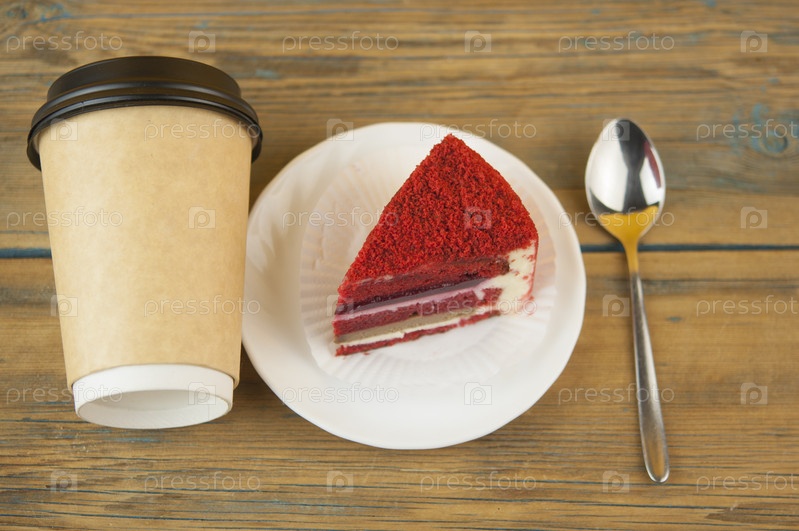 Красный бархатный сливочный сыр с черным кофе в бумажной чашке, деревянный фон