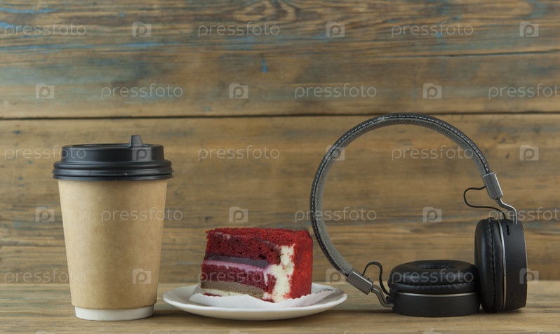 Красный бархатный сливочный сыр с черным кофе в бумажной чашке, деревянный фон