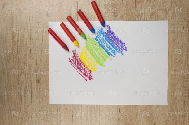 Детские нарисованные радуги и цветные мелки на белом фоне