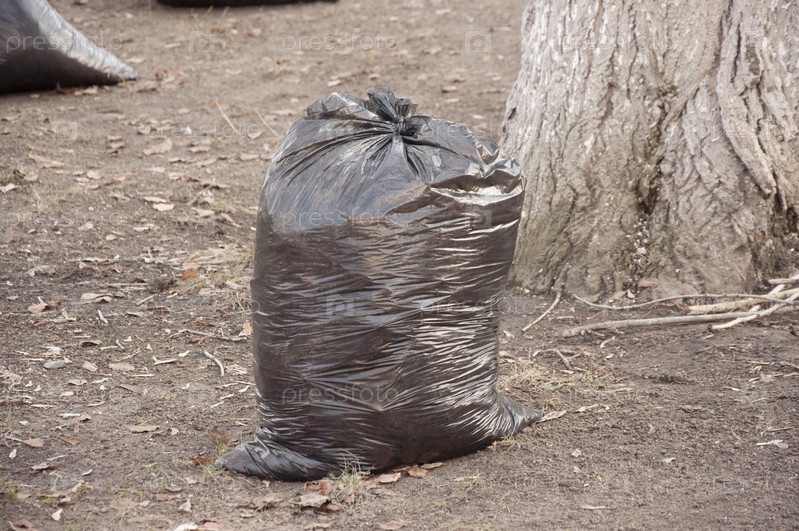 Черные мешки, наполненные осенними листьями в парке. Уборка городского парка от опавших листьев