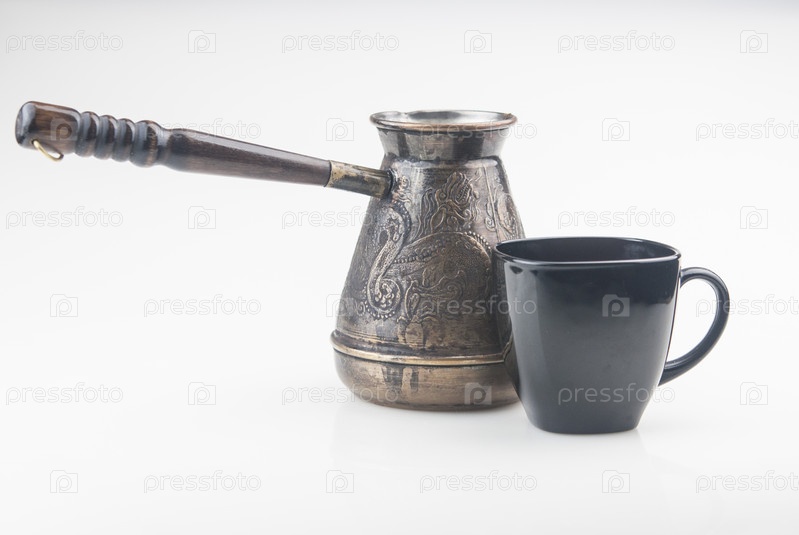 Черная чашка кофе, медная турка на белой спинке. Низкий ключ. Копировать пространство