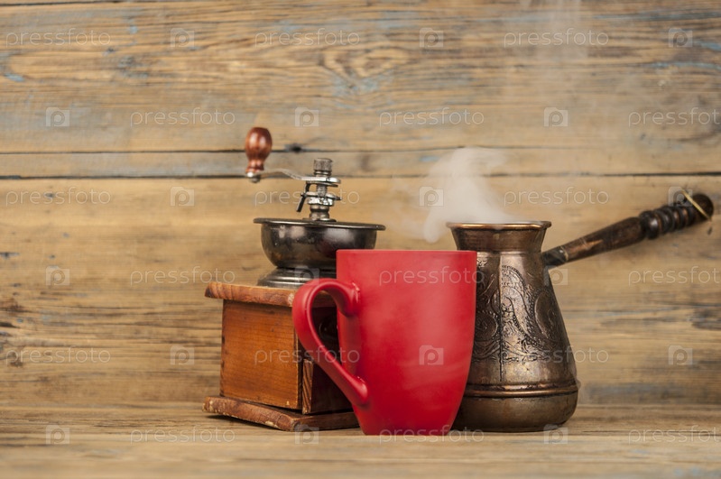 Чашка кофе, кофейные зерна, турка, кофемолка на деревянном фоне