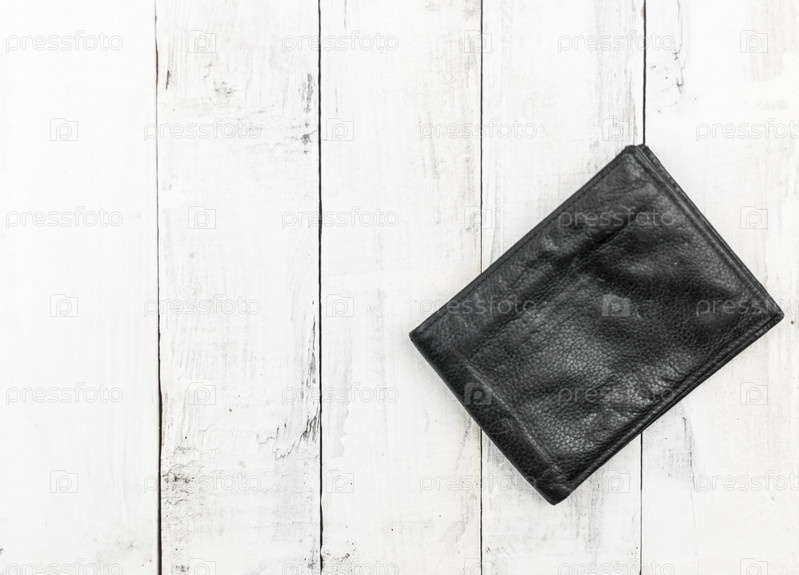 Черный кожаный кошелек на фоне деревянной доски