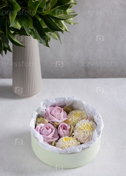 Домашний Зефир в подарочной упаковке, красивый нежный букет цветов Зефир, концепция праздника, подарки