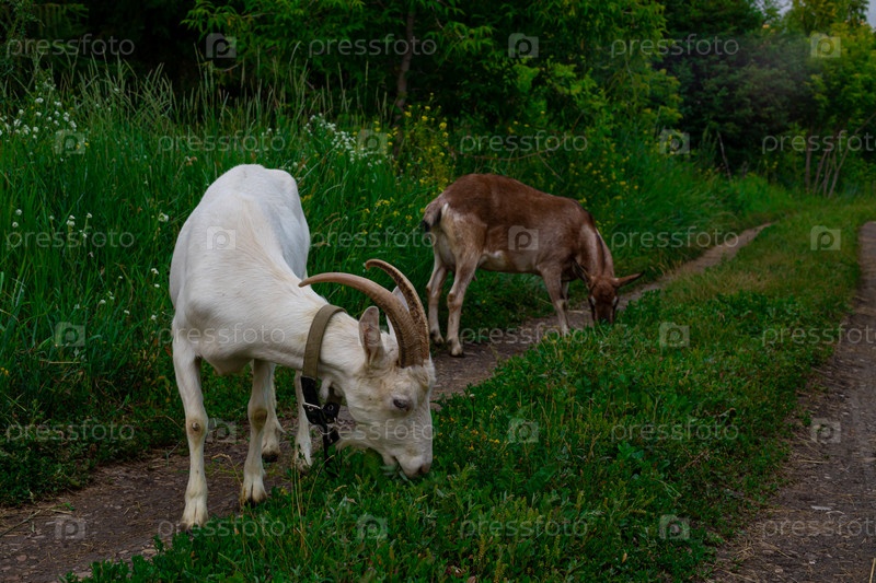 Самка белой рогатой козы питается свежей экологически чистой травой, крупным планом сельского пейзажа
