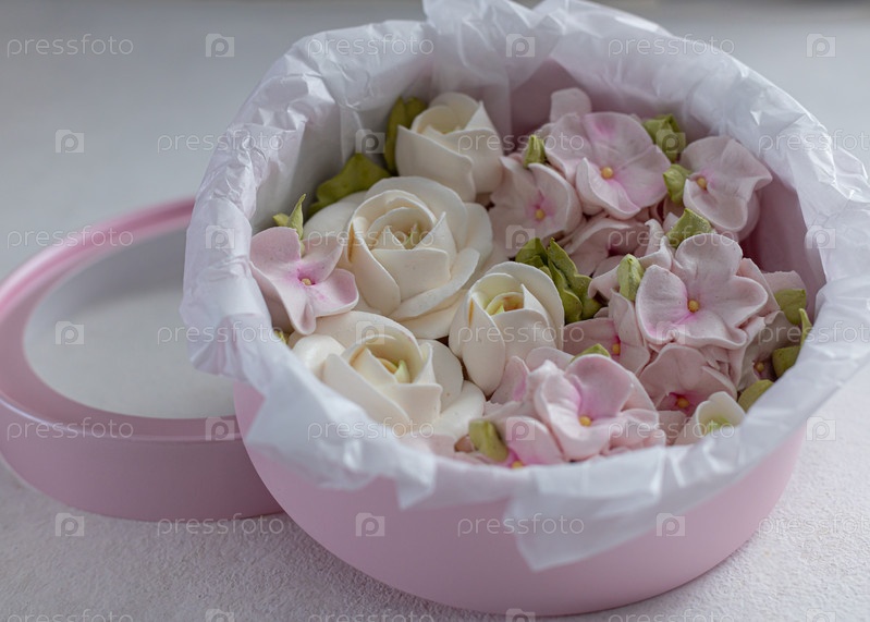 Домашний Зефир в подарочной упаковке, красивый нежный букет цветов Зефир, концепция праздника, подарки