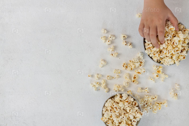 Чаша вкусного попкорна на светлом фоне, натуральная вкусная еда для просмотра фильма