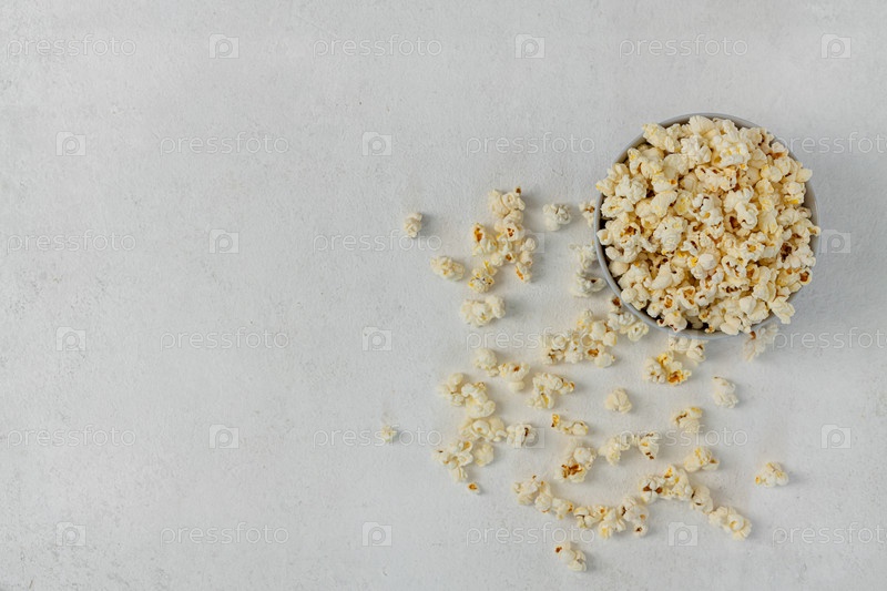 Чаша вкусного попкорна на светлом фоне, натуральная вкусная еда для просмотра фильма