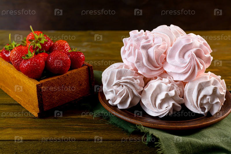 Домашний розовый зефир клубники или зефир на деревянном столе