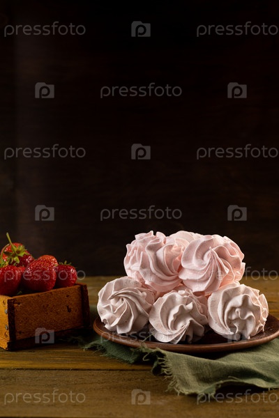 Домашний розовый зефир клубники или зефир на деревянном столе