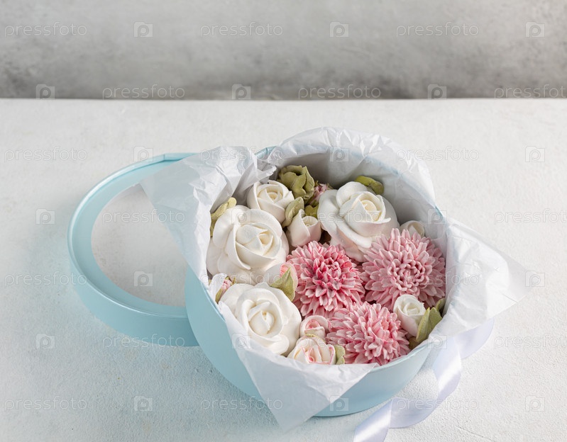 Домашний зефир в подарочной коробке на светлом фоне, красивый нежный букет цветов зефира, концепция праздника, подарки