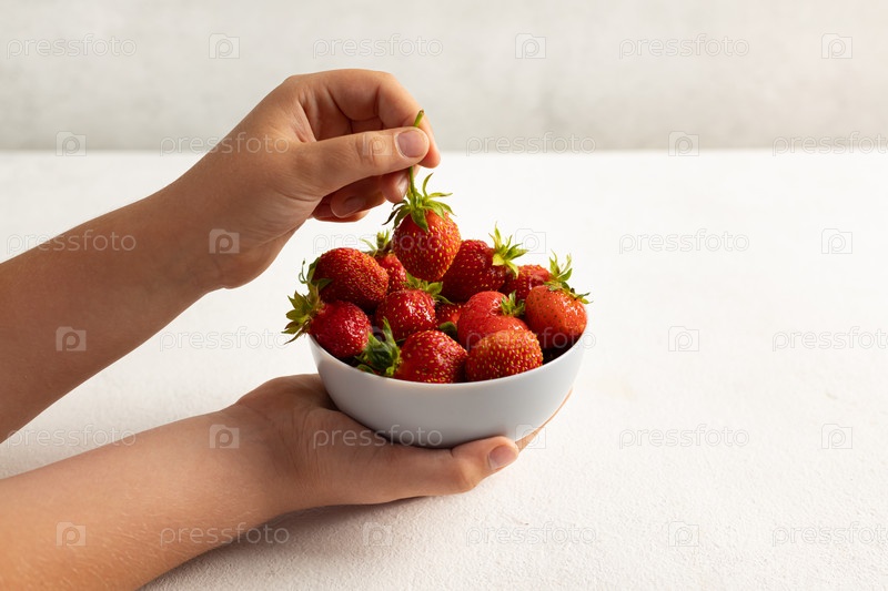 Детская рука держит клубнику на светлом фоне, тарелка с клубникой. Концепция летнего здорового питания. Вид сбоку
