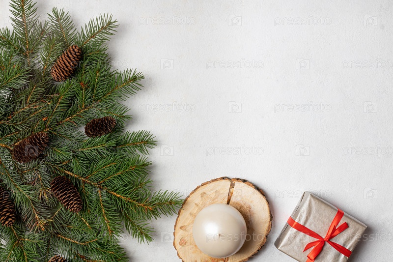 Тема зимних праздников – подарки с елочными украшениями и елкой. вид сверху. копия пространства, баннера, открытки