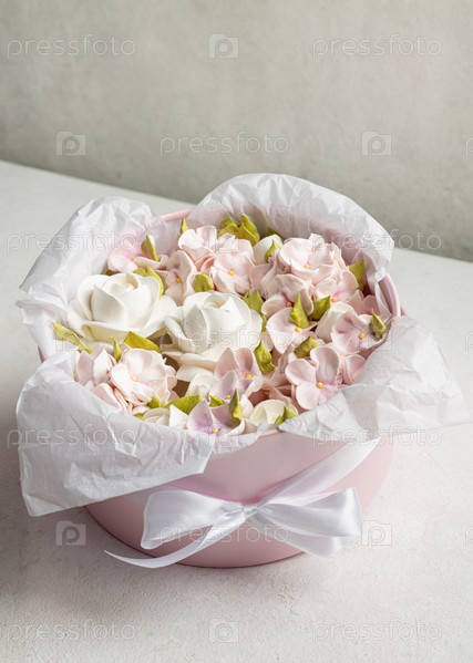 Домашний Зефир в подарочной упаковке, красивый нежный букет цветов Зефир, концепция праздника, подарки