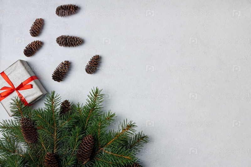 Тема зимних праздников – подарки с елочными украшениями и елкой. вид сверху. копия пространства, баннера, открытки
