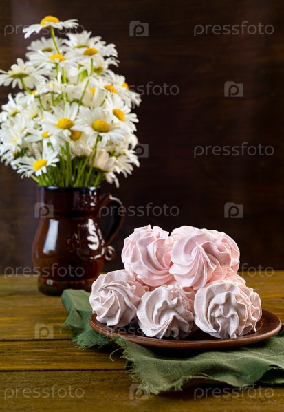 Домашний розовый зефир клубники или зефир на деревянном столе