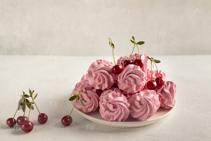 Вкусный сладкий зефир и вишня на светлом фоне, концепция здорового и здорового домашнего производства