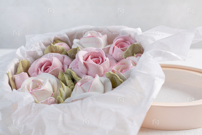 Домашний зефир в подарочной коробке на светлом фоне, красивый нежный букет цветов зефира, концепция праздника, подарки